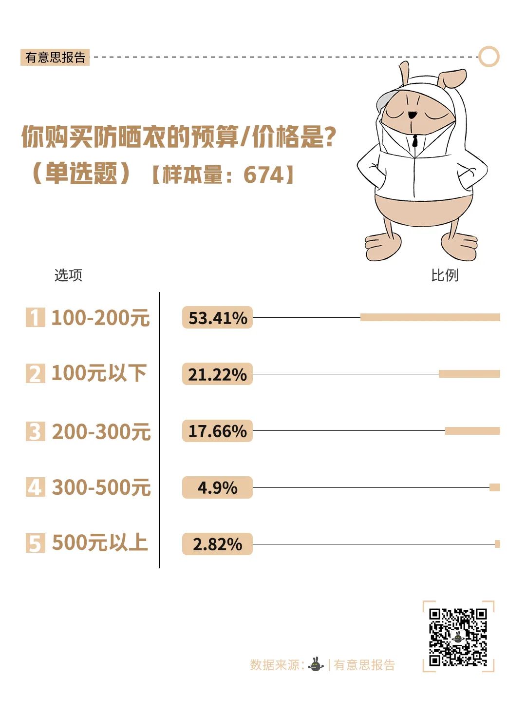 调查数据也这证明了这一点,有近三成人提升了在买防晒衣时的预算,其中95和90后消费升级意愿最强。有近三成人愿意为200元以上的防晒衣买单。