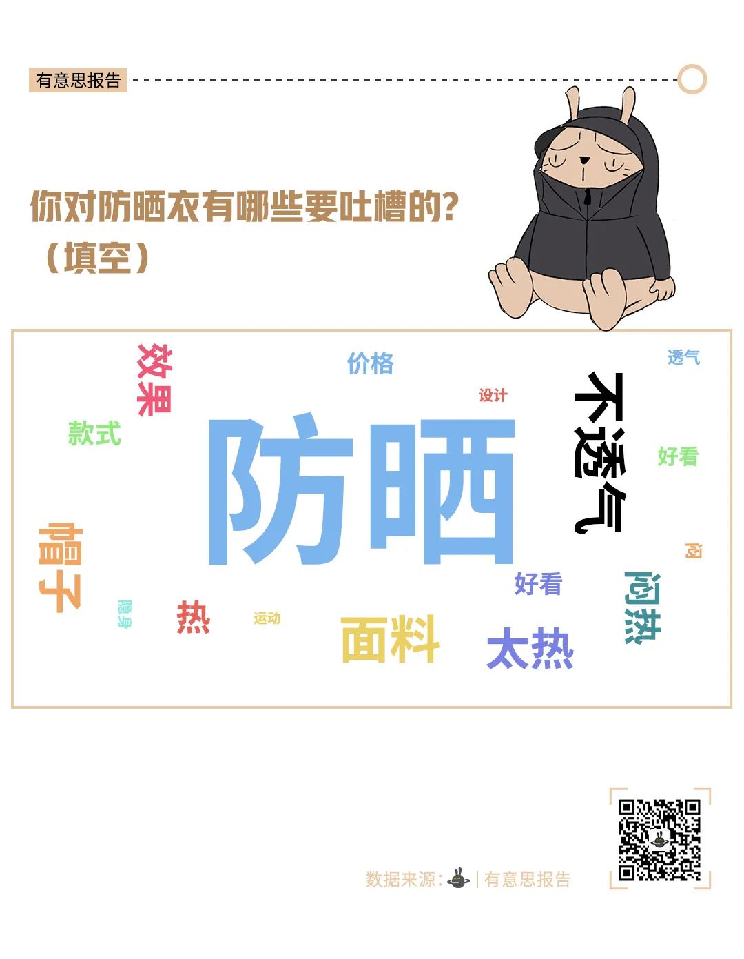 具体来看,凉爽、防晒,防晒衣的两大基本功能依然最受重视。但多了一个“更”字,反映出当前的使用感受还有待提升。