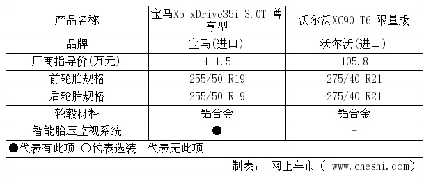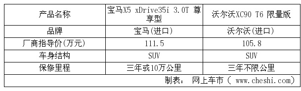 今天带来的宝马X5为x Driver35i 3.0T尊享型,售价为111.5万元,而XC90为T6限量版,售价为105.8万元,虽然两款相差5.7万元,但是由于两款车都属于豪华级别SUV,因此几万元的差价并不是很多。宝马X5保修里程为三年或10万公里,而XC90保修里程为三年不限公里。