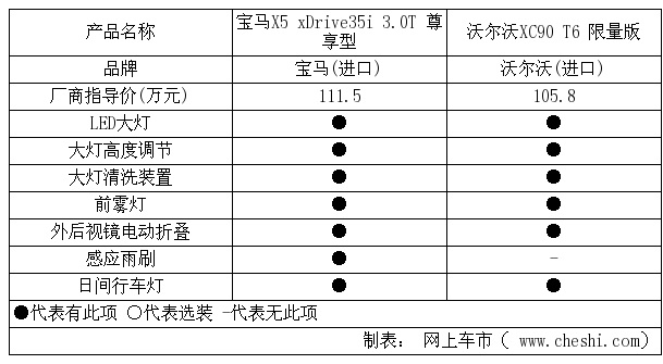 从上表可以看出,两款车配置都很全面,无论是LED大灯还是大灯高度调节,或者后视镜电动折叠两款车都有配备。唯一不同的就是宝马X5配备感应雨刷,而XC90并未配备。感应雨刷能够通过车外雨量进行自动开启,如果在长途驾驶当中,能够给驾驶者带来很大便利。