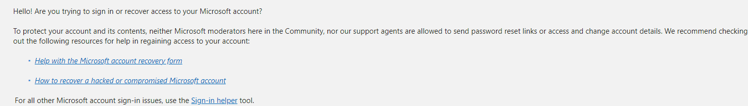 Enter聽MSA聽in the question field, click聽Get Help, and then click聽"Sign in to contact support" at the bottom of the page. Sign in to your聽personal聽Microsoft account**, you may need to create a new account to establish contact with them or use account you are using on this forum. School and corporate account will not work.** Under聽Products & Services, select "Other Products." Under聽Category,聽select "Manage Account Security" and click Confirm. Click聽on "Chat with a support agent in your browser".Don't forget to contact online support during聽business hours according to local timefor the best support experience.聽Online support is not open 24/7.