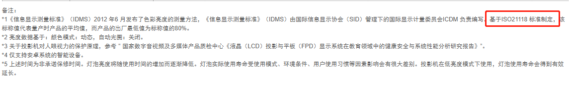尽管部分投影机不会在参数表上标注“ISO流明”,但其可能会在底下增加“基于ISO21118标准制定”之类的说明