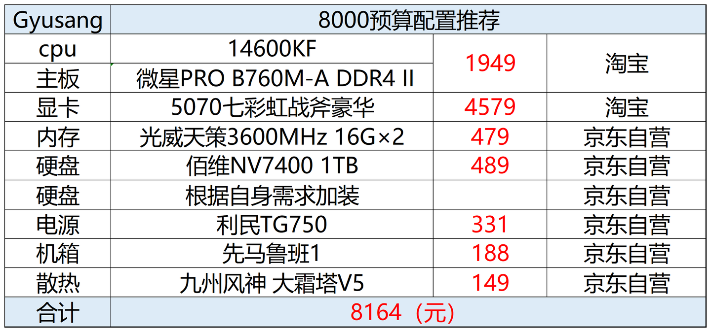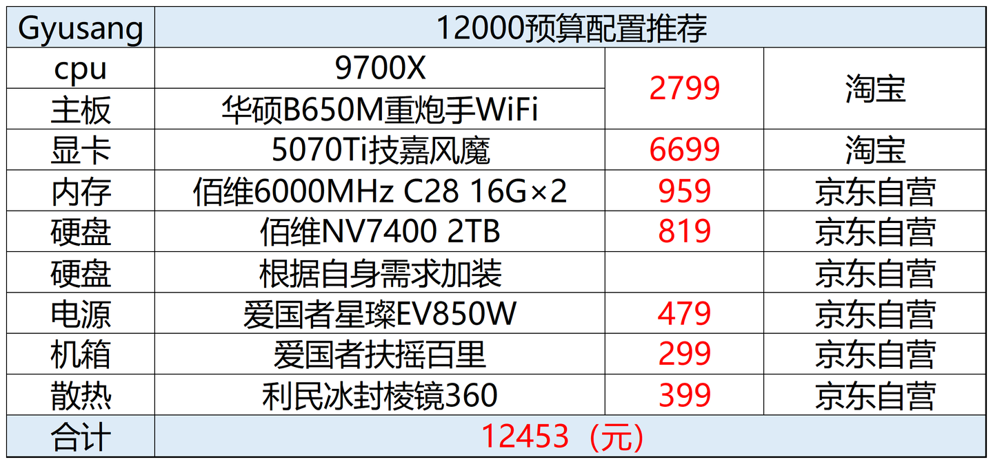 14000预算可以9700X+5080,其他就标配 32G+2TB 内存和硬盘,佰维的性价比很高,850W PCIe5.0电源,也是性价比型号。