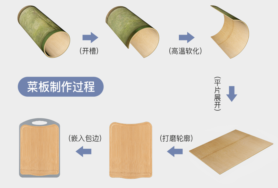 每一块原竹都需要经过高温软 '化、展平、干燥、打磨 等20多项繁琐工艺,而且因为每颗竹子的纹理不同,做出来的砧板也是独—无 '二的。