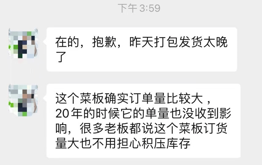 厂家告诉我,厂里都是三十多年经验的老 '师 '傅, 这个菜板花费心血比较大,很多线上线下的商 '铺都来订货。