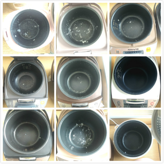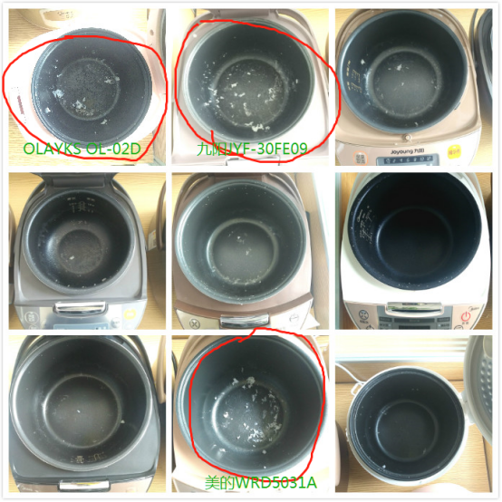 反倒是第一排左边的OLAYKS OL-02D、第一排中间的九阳JYF-30FE09和第三排中间的美的WRD5031A,让人大跌眼镜。同志们,这才第一次使用就这么粘锅,这以后可怎么办啊,不太给力哦~