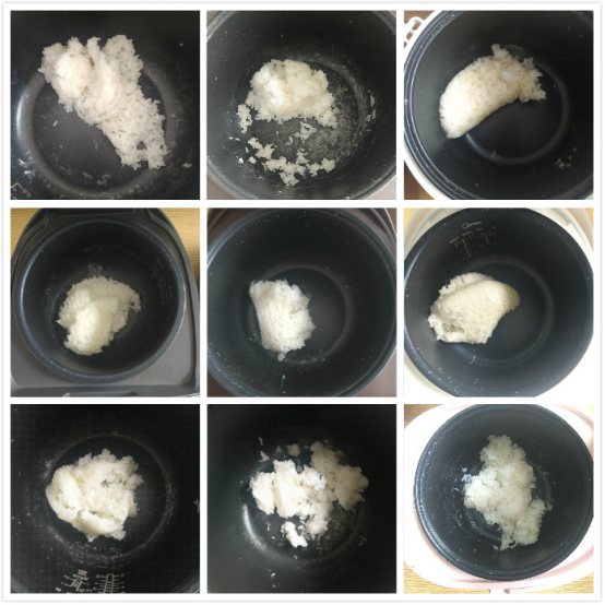 为了测试电饭煲煮出来米饭的口感,我用相同的大米,相同的用量与水量煮出来了九锅香喷喷的大米饭进行对比,上图: