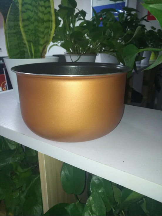 首先是市面上普遍的材质,铝合金内胆。铝合金内胆导热均匀,但是其存在的缺点是不能够直接接触食物,所以我们把它的表面涂上一层涂层,来与食物隔离。