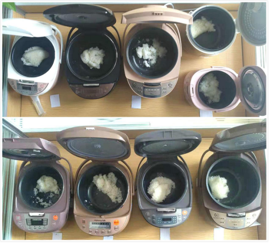 从图片上大致可以看出第一排第三个这款电饭煲把米饭煮出了锅巴,米饭已经开始发黄了,除了这个,还有第二排第三个电饭煲也有类似问题,煮出来的米饭可想而知。