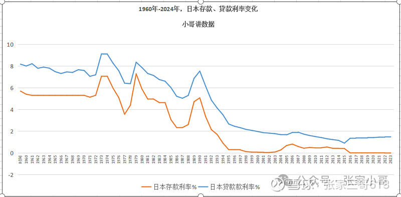如上图,今天小哥给大家整理下,日本财政政策从1960年到2024年这60来年,居民长期存款利率与银行贷款利率变化情况。