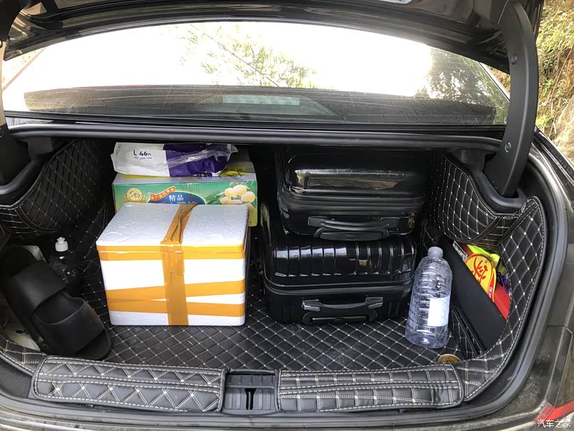 右侧变道辅助黄色警示灯(固定摄像头安全拍摄)3.空间和内饰我购买这辆车的原因之一也是因为空间,车长接近5米,我173的身高,前排调整好驾驶位之后,后排还有四拳多距离,跷二郎腿都没问题;有时拉亲戚朋友,他们都会夸赞说“你这车后排空间还挺宽”;后排唯一不足就是中间有凸起,坐三个人的时候中间这个人放脚不太方便,如果坐两个人还挺合适,再把后排水杯架放下来,就成了标准的商务座。后备箱很大,我喜欢露营,可以拉很多露营装备,如果放行李箱的话可以放两个大行李箱和一些杂物没啥问题,所以空间对普通家庭来说完全够用了。内饰的话就没多少亮点了,毕竟商务属性多,门板、中控台的塑料比较多,传统的档杆,内饰没有豪华感,时间久之后中控台的装饰板会有一点异响,对强迫症患者真难受。
