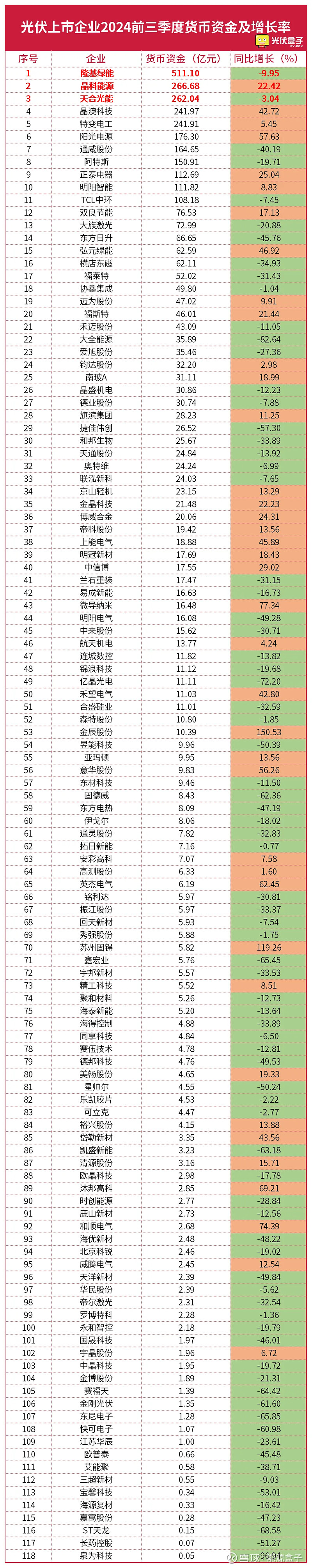 光伏盒子根据118家光伏上市公司2024年前三季度总资产、营业收入、归母净利润、货币资金、毛利率、经营现金流净额、研发投入、负债率等核心数据制作了九大排行榜。