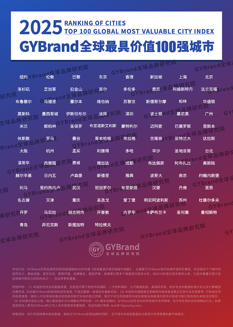 3月25日,GYBrand全球品牌研究院独家编制的2025年《全球最具价值城市100强指数》正式发布。这是一份全面展示全球城市综合实力的榜单,并不是简单按照城市的GDP或者人口规模排序,而是从经济实力、基础设施、居住生活、商业环境、国际声誉、发展潜力、全球化品牌建设等多个维度进行综合分析,最终发布2025全球最佳城市100强排行榜。自2020年首次发布榜单以来,已成为衡量中国乃至全球城市软实力的风向标,在业界享有盛誉。