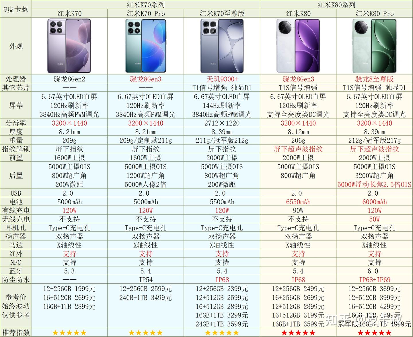 三、红米K系列(2000-4000元)性价比还得看小米的子品牌红米。红米K80系列与上一代参数对比如下: