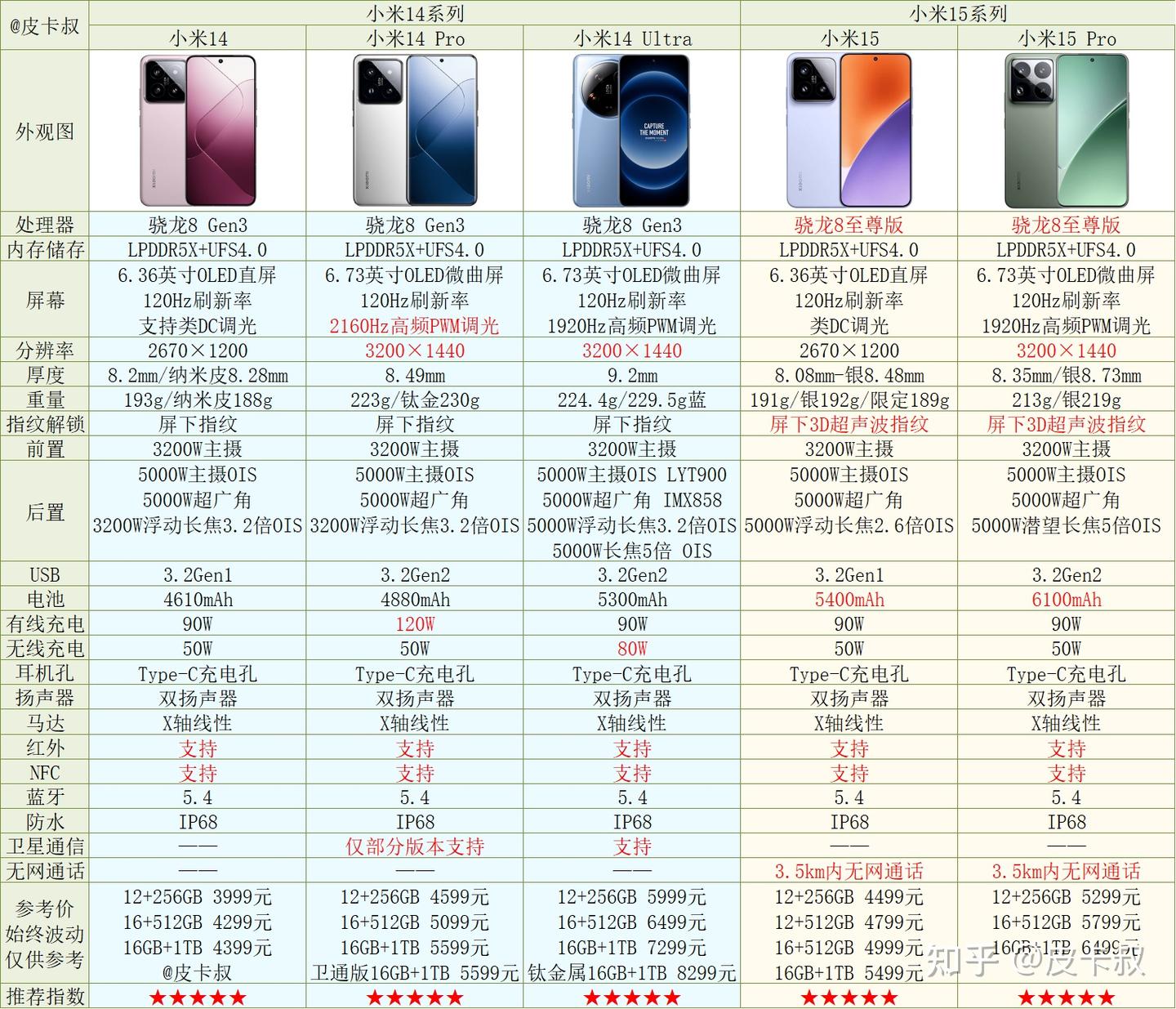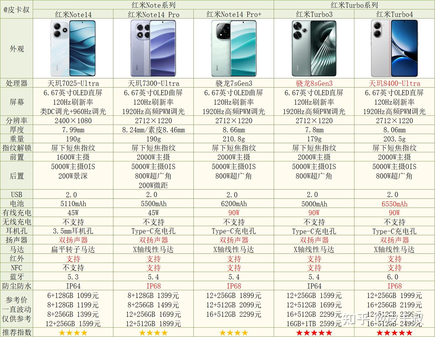 四、红米Note系列和Turbo系列(1000-2500元)红米Turbo系列性能更好,性价比比Note系列高一些。各机型参数对比如图: