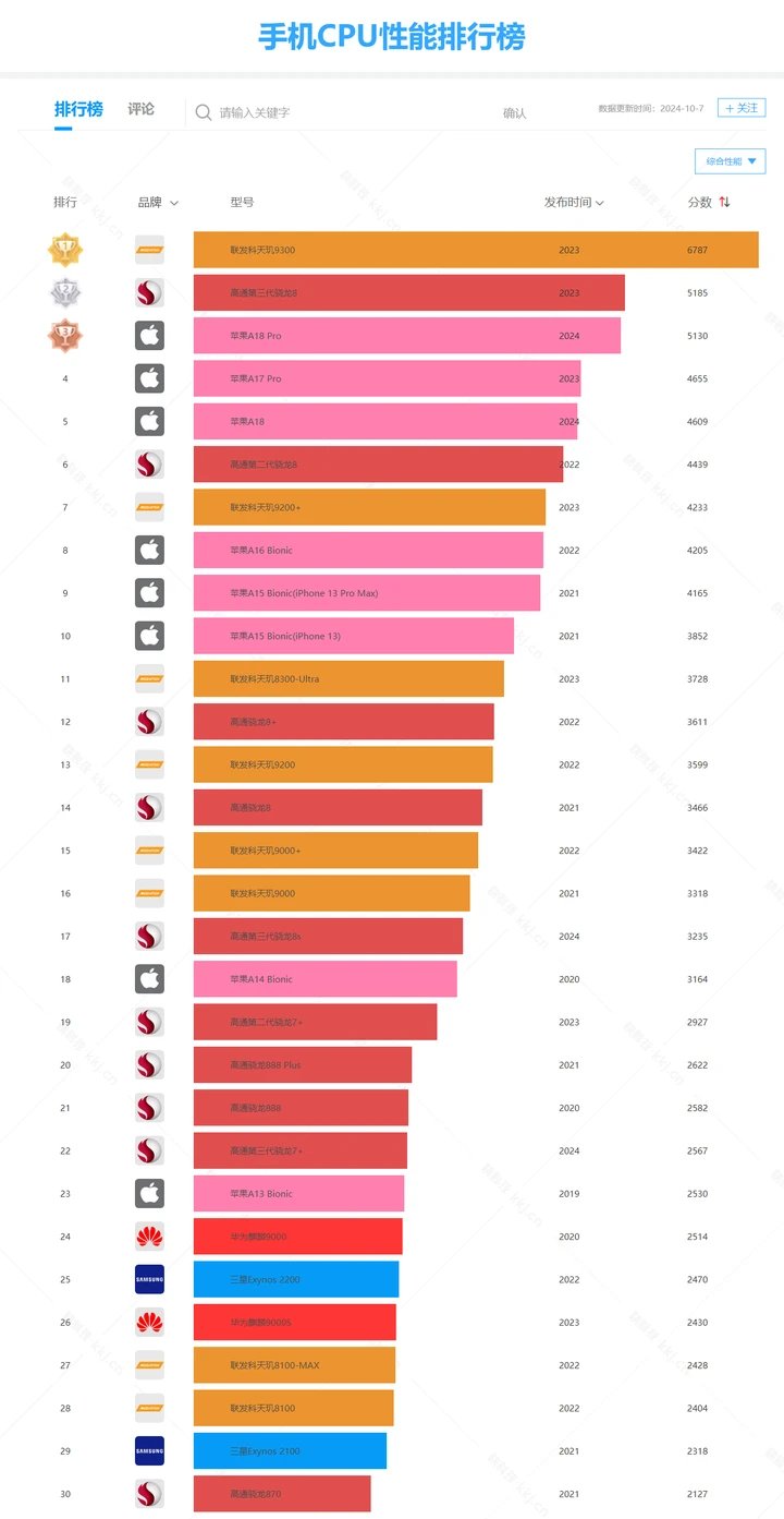 当前安卓各品牌旗舰机骁龙8 至尊版和天玑9400为最强,其次到骁龙8 Gen3、天玑9300、骁龙8 Gen2、天玑9200+;苹果移动处理器更新到A18Pro。