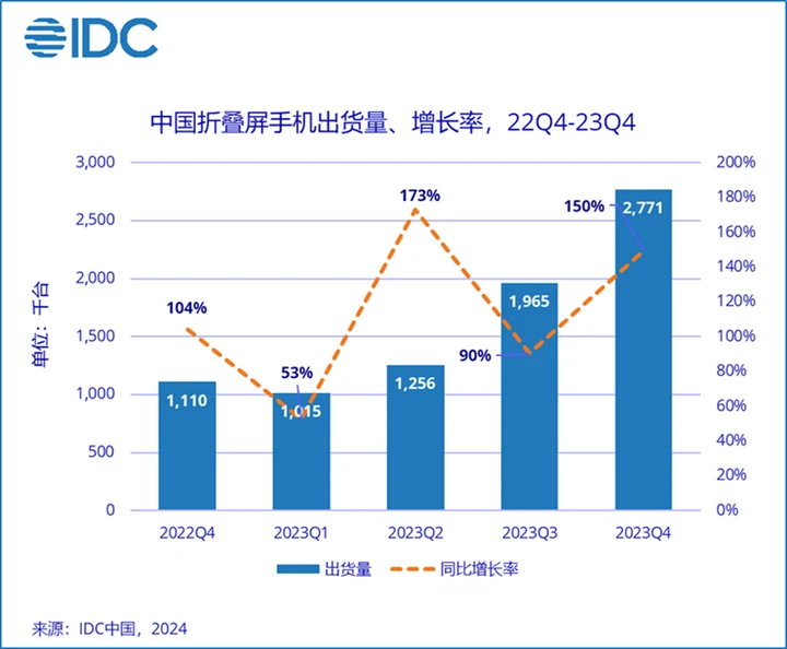 另外,折叠屏手机作为小众但形态新颖的产品,在国内智能机市场中的出货量每年都超过100%的增速。从2023年中国的折叠屏手机市场份额来看,2023年全年中国折叠屏手机市场出货量约700.7万台,同比增长114.5%,折叠屏的发展空间巨大。