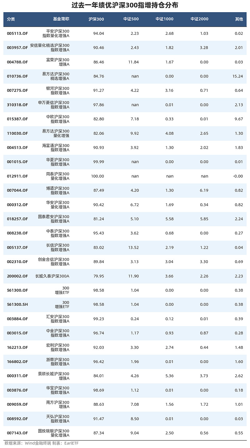 接下来,还是遵循之前的思路,对于截至8月31日,过去一年表现高于中位值的沪深300指增基金,进行全部持仓的穿透分析,查看每个持仓股票分别属于沪深300还是中证500、中证1000、中证2000乃至于小微盘。