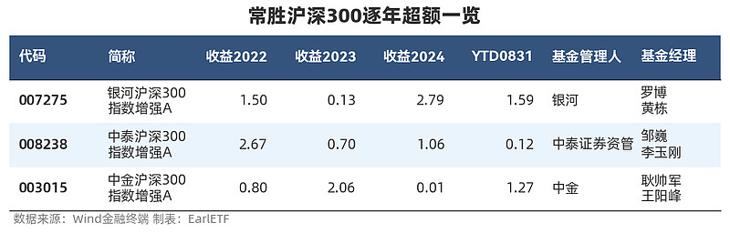 事实上,如果我们要求2023年、2024年和2025年1-8月都能跑赢110020的话,庞大的指增中,就只剩下三只基金了,分别来自银河、中泰证券资管和中金。从每年的超额来看,一般也就是1-2个百分点,这其实也是当下沪深300指增类目下算比较理想的稳健超额水平了。