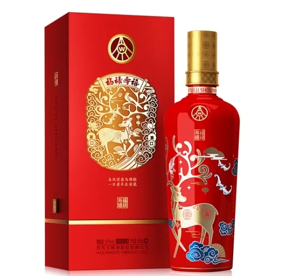 前面两款都是酱香型白酒,如果不喜欢可以考虑这款福禄寿喜婚宴用酒,这款是五粮液旗下,专门为婚宴喜酒开发的产品。整个包装都是中国红,外观大气有档次,瓶身为陶瓷材质,上有印花,从瓶子到外壳都是金色+红色的组合,特别喜庆,适合婚宴这样的喜庆场合使用。