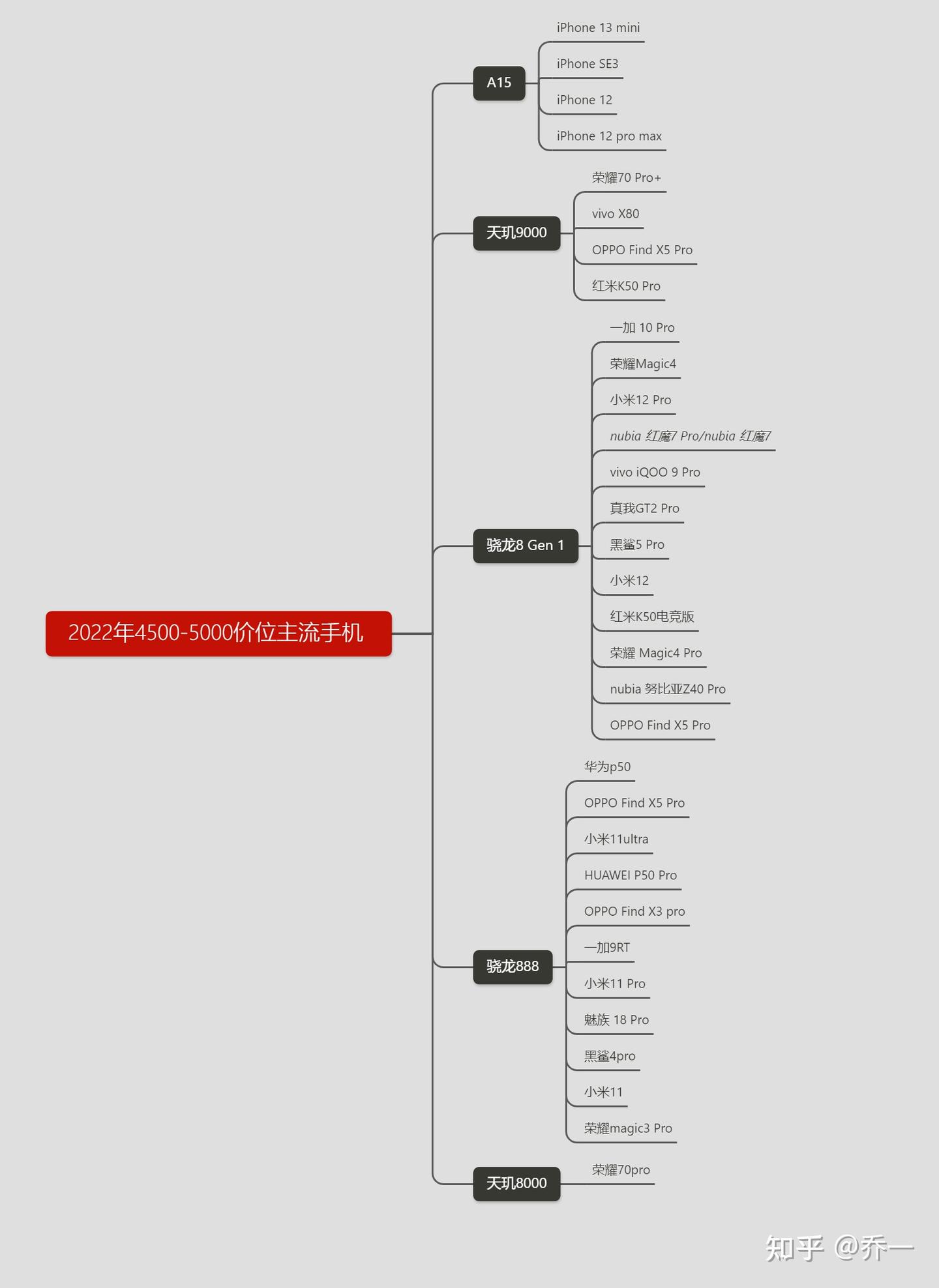 游戏爱好者更多地考虑手机处理器、屏幕刷新率、触控刷新率和散热能力等等;商务出差人士更多地考虑手机电池容量、充电速度、内存运存大小等等;父母长辈们更喜欢信号好续航好充电快耐摔的手机;小姐姐们喜欢拍照好颜值高的手机;二、手机梳理(注:处理器性能从下往上越来越好,每个处理器包含的手机各方面整体性能从下往上越来越好)