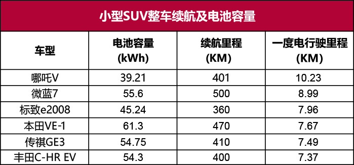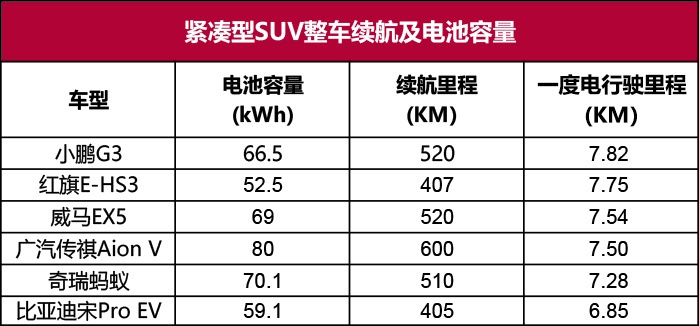 从表格中能够看到,目前国内紧凑型SUV的每度电行驶里程差距并不算太大,基本上大家的表现都在每度电行驶7.5km左右;唯有比亚迪的宋Pro EV的表现稍低,每度电仅行驶6.85km。总的来说,紧凑型纯电SUV领域大家的电耗水平都差不了多少;换算成燃油车思维的话,就是大家热效率都差不多,不用太纠结。