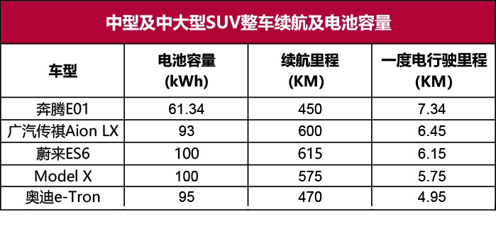至于中型及中大型SUV,除了本次新上市的奔腾E01表现尤为出众,其余车型的每度电行驶里程都在5.0km左右。对于这样结果其实也是非常正常的,一方面这个级别的车型往往车身整备质量较大,车身风阻也较大;另一方面,这个级别的车型一般轮胎都比较宽大,也会造成比较大的行驶阻力。