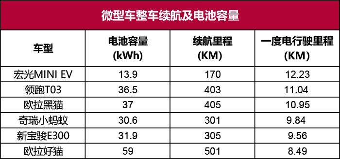 在目前市场上比较常见的6款微型车中,能够看到表现最好的是来自五菱汽车的宏光MINI EV,虽然整车只有13.9kWh的电池容量,却凭借着优秀的三电系统、极轻的车身重量以及较窄的车身轮胎,成功让续航里程突破了170km,换算下来一度电能够跑12.23公里。这样的成绩即便是对于微型车而言,也是十分优秀的了。