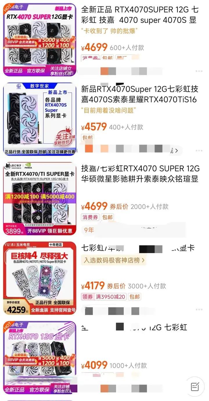 现在RTX4070S货源总算放开一些,很多第三方价格也降了许多,基本4600+就能买到RTX4070SUPER: