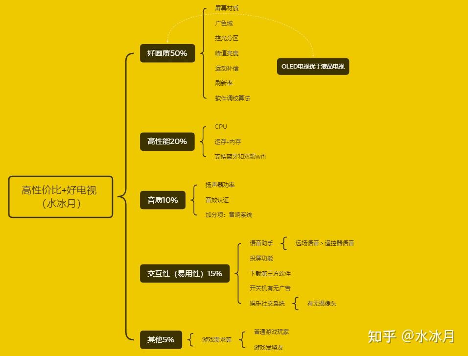 =好画质50%+高性能20%+交互性(易用性)15%+音质10%+其他5%