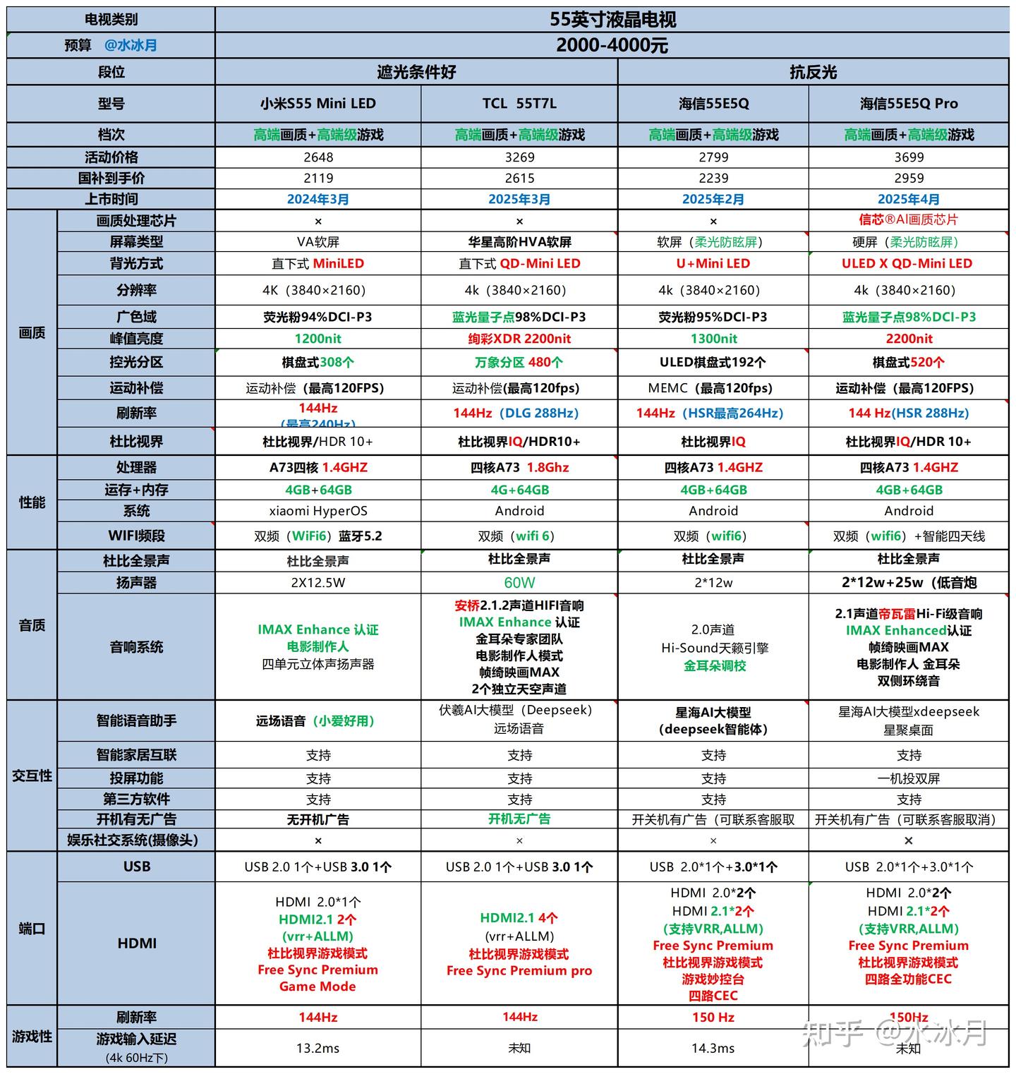 上市时间:2025年4月定位:高端画质+高端游戏电视优点:作为海信2025年主力机型,以合理价格提供了画质芯片、高分区数、高亮度和抗反光等多项高端特性,是4000元以下预算的55英寸电视最佳选择之一。搭配家电补贴后性价比极高,适合对画质和抗反光有需求的用户。