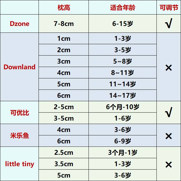 经过枕高的数据对比,little tiny适合6岁以下的孩子,Dzone适合6岁+的大童,Downland、可优比、米乐鱼适合的年龄段范围更大一些,这些枕高都是符合孩子生长发育的不同时期,之所有有细微的差别,也是源于个体差异性,大家根据枕高判断方式进行选择就可以啦。