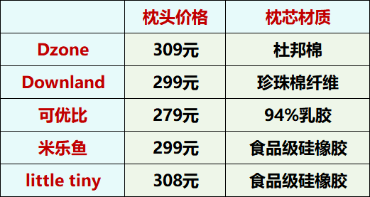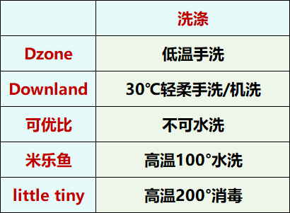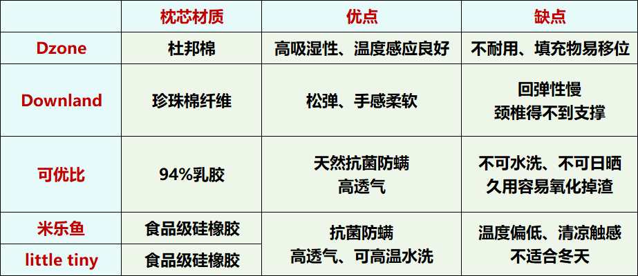 清洗度就看枕头是否可以水洗,水洗又细分为低温水洗和高温水洗,大家可以先看看表格,仅有可优比乳胶枕是不支持水洗的,其他四款均能水洗。▼