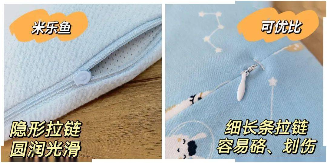 除了粘毛发程度以外,枕套的拉链也很重要,因为孩子睡觉总是翻来覆去,枕套的拉链很小,但是突出来的位置还是容易硌到孩子。但米乐鱼因为做睡袋起家,所以对于孩子床品衣服的舒适度还是非常重视的,包括拉链也设置成了隐形拉链,安全放心。▼