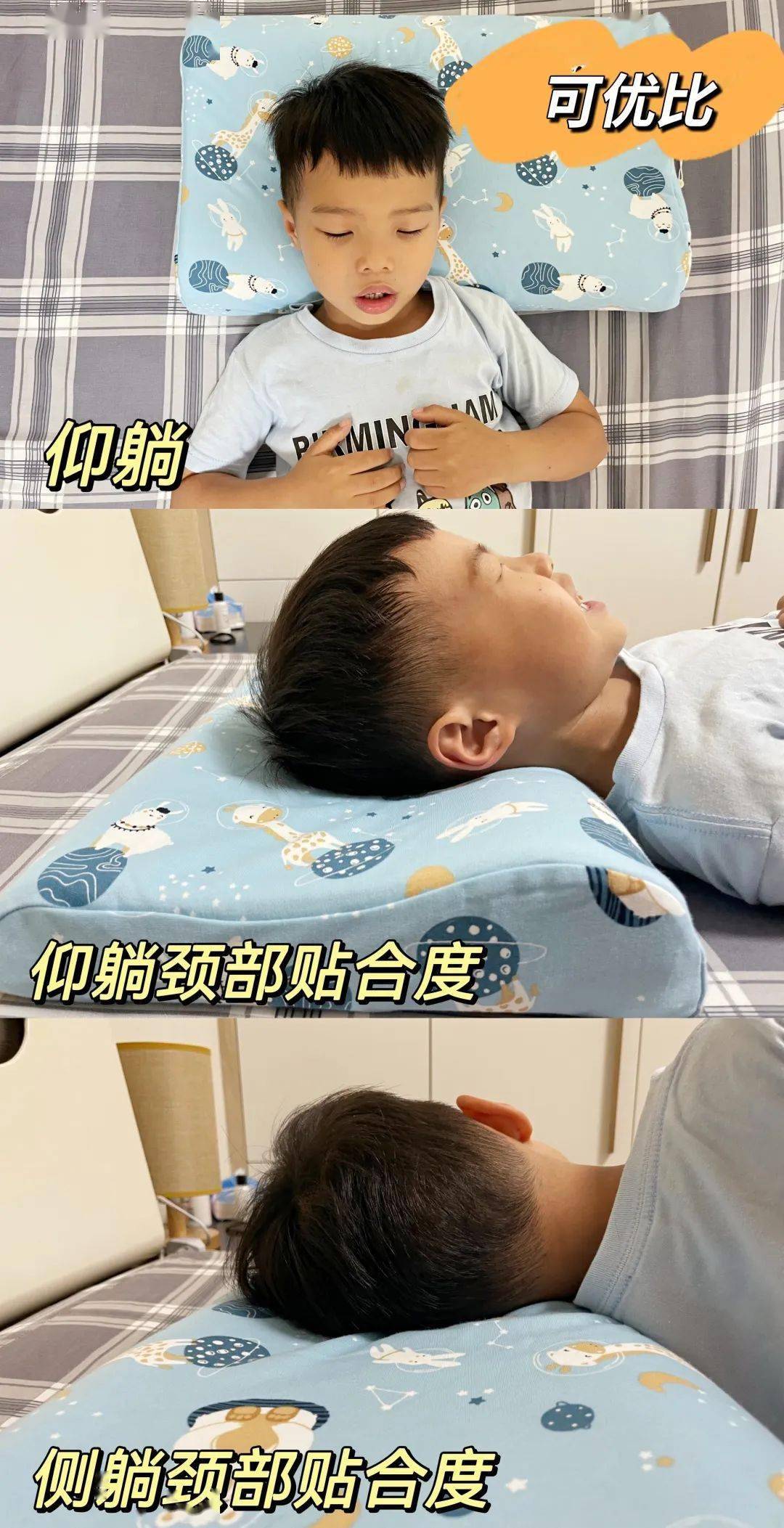在判断枕高的同时,也需要仔细观察孩子在仰躺、侧躺时颈部与枕头的缝隙,孩子感受到有枕头的支撑并不会觉得枕头硌,就是贴合得很好。▼