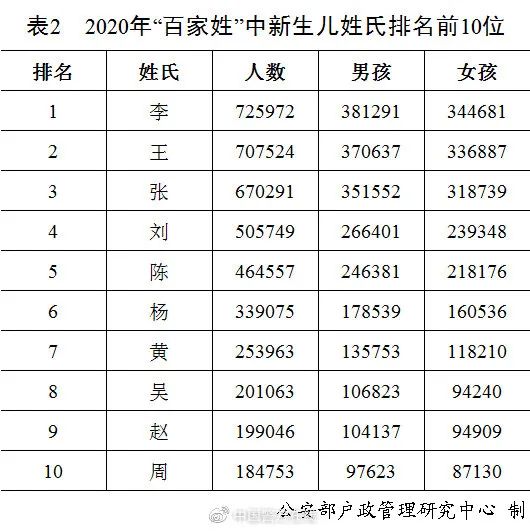 截止到2020年12月31日,2020年出生并已经到公安机关进行户籍登记的新生儿共1003.5万,其中男孩529.0万,占52.7%,女孩474.5万,占47.3%。2020年“百家姓”中新生儿登记姓氏最多的是“李”,共72.6万人,最少的是“顾”,仅1.7万人。