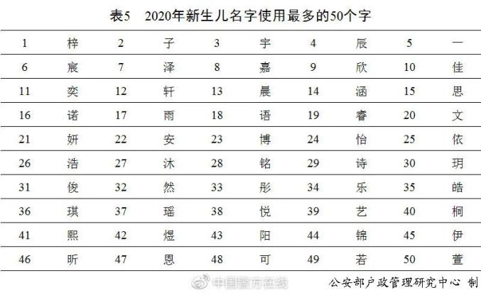 2020年出生并已经进行户籍登记的新生儿名字中,使用频率最高的50个字依次为“梓”“子”“宇”“辰”“一”等。与2019年相比,“玥”“伊”“昕”“可”等字受到新生儿父母的青睐。