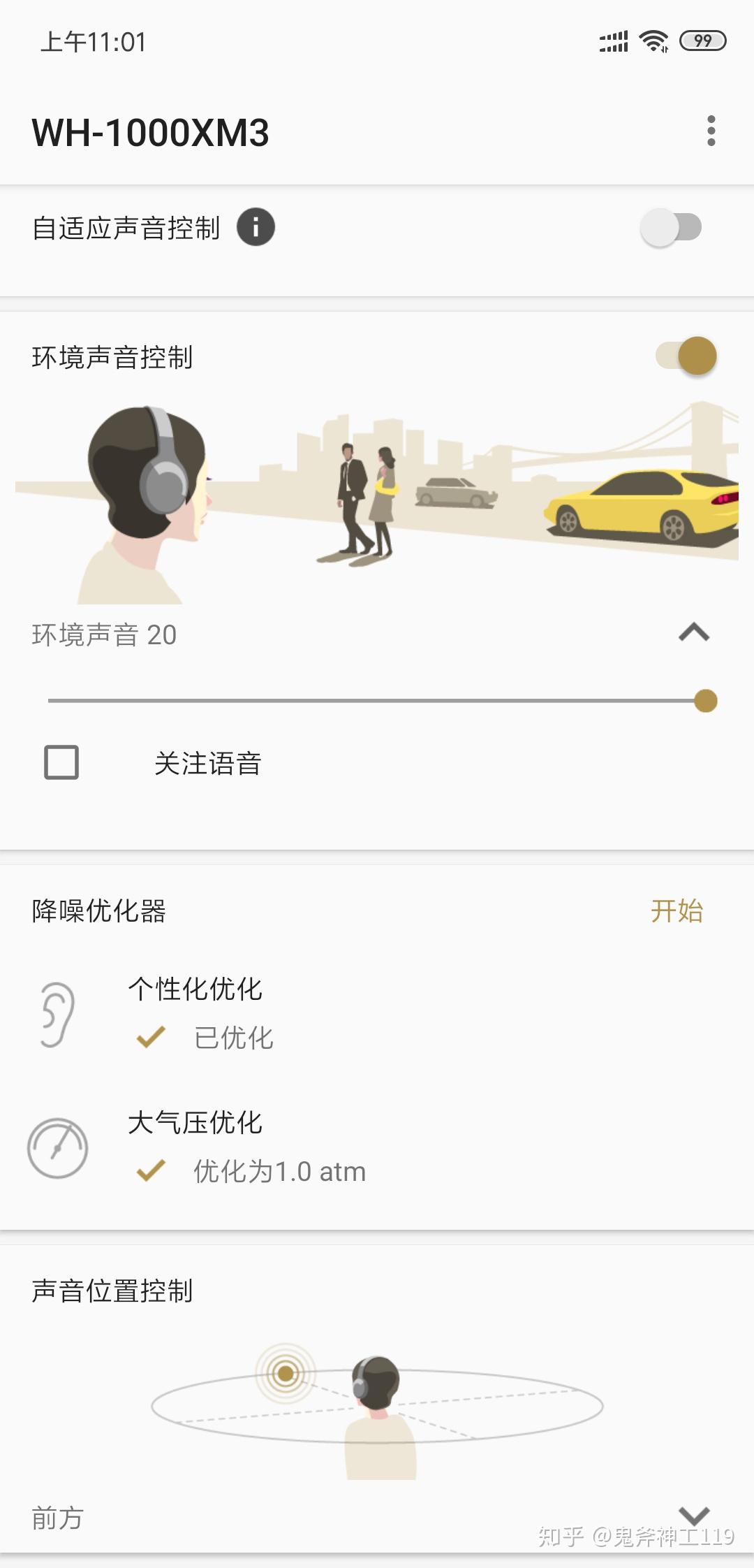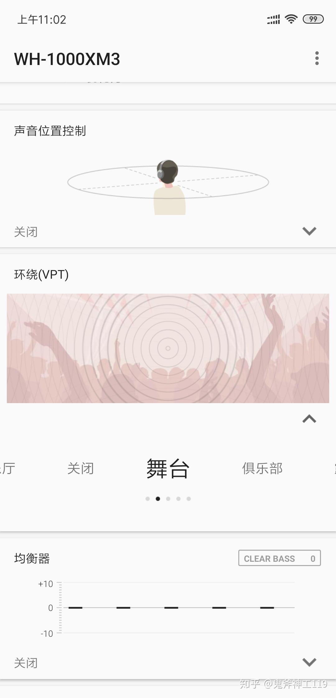 再说说声场吧,虽然耳机声场都很捉急。但是这个价位的耳机,我们作为消费者还是有理由有一点微小的要求。BOSE这个耳机完全没有sound stage。。。没有任何乐器是从前面发出的,基本上所有声音都在人的两侧。索尼也差不多,但是稍微好一点,人声宽度比BOSE窄一些,但还是远宽于真实声像。。。于是我尝试打开索尼的一些特殊音效,首先我把声源定位调在前面。。。