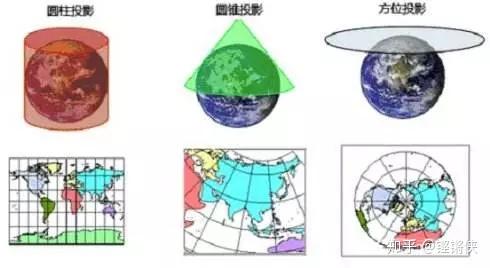▍按照投影到平面上的不同可以分为方位、圆锥、圆柱投影