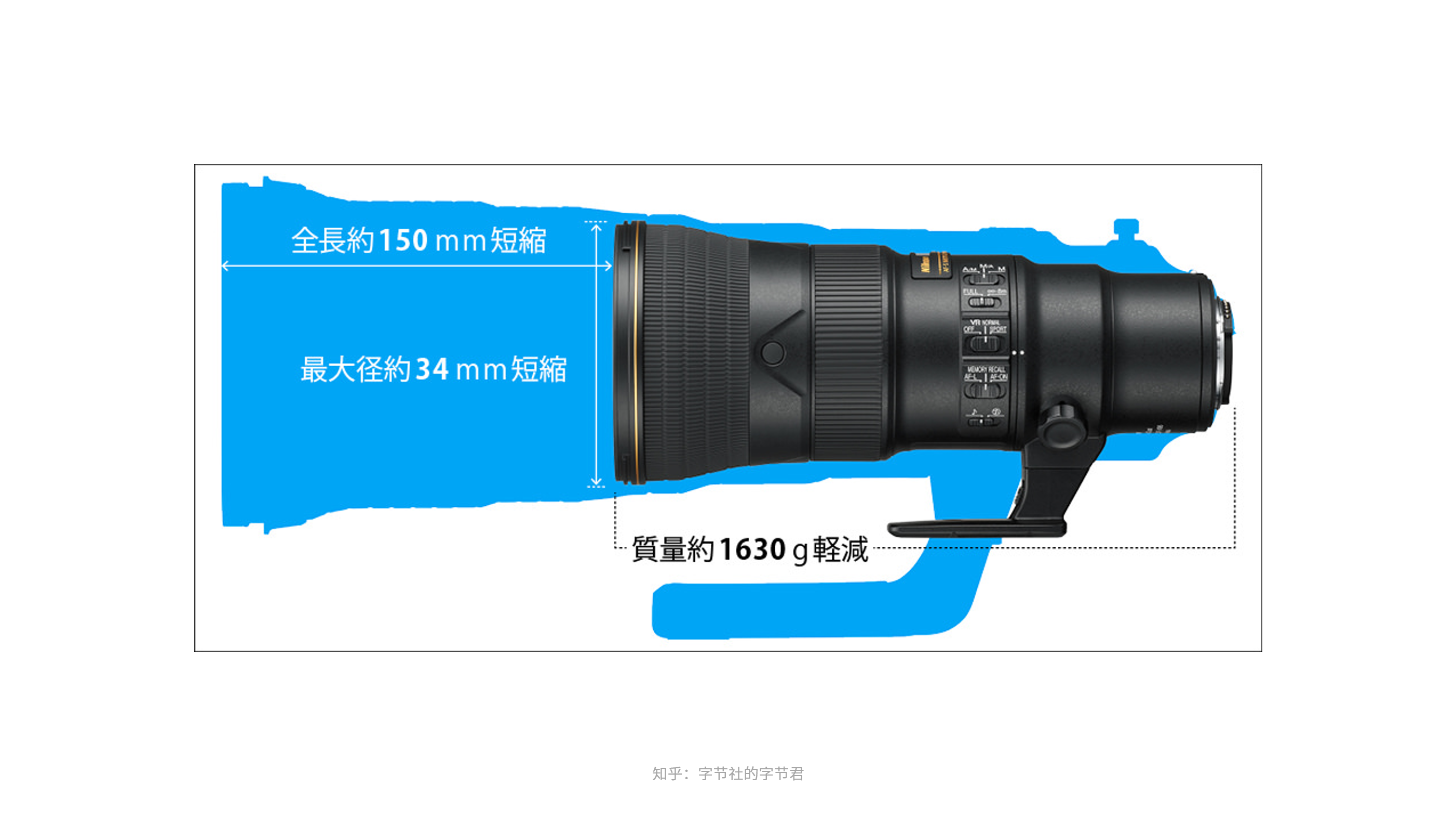 使用了 PF 镜片的望远镜头大幅度缩减体积和重量尼康的 AF-S 300mm f/4E PF ED 和 AF-S 500mm f/5.6E PF ED 镜头都使用了这一元器件,广受好评。