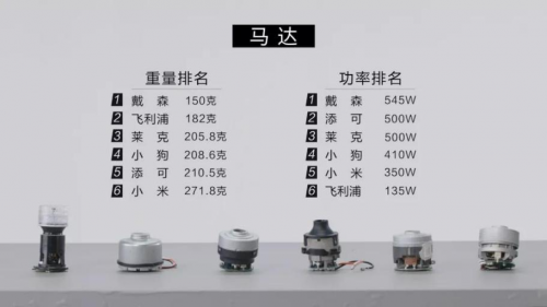 一个吸尘器的好坏可以从马达、气旋、吸头三方面入手分析,其中马达是一个吸尘器的核心,马达越轻、功率越高是越好的。从数据指数可以看到,戴森是里面最轻,但是功率最高的。气旋,在吸尘器中起到关键作用,主要是为了让尘气有效分离,增加吸尘效率、减少堵塞概率。刷头作为直接与地面接触的配件,要有不同的材质设计。戴森的刷头采用了四条碳纤维刷头加植绒的材质,吸尘的时候会产生静电,碳纤维材质的刷条可以防止静电的产生,让灰尘被吸入尘桶中而不会被刷头缠绕。
