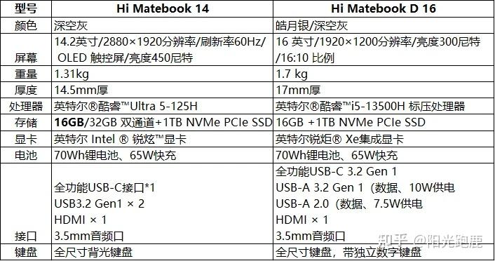 四、硬件配置及性能测试直接拉表看下Hi MateBook 14(我这个是16G内存版本)和Hi MateBook D 16的配置信息一览。