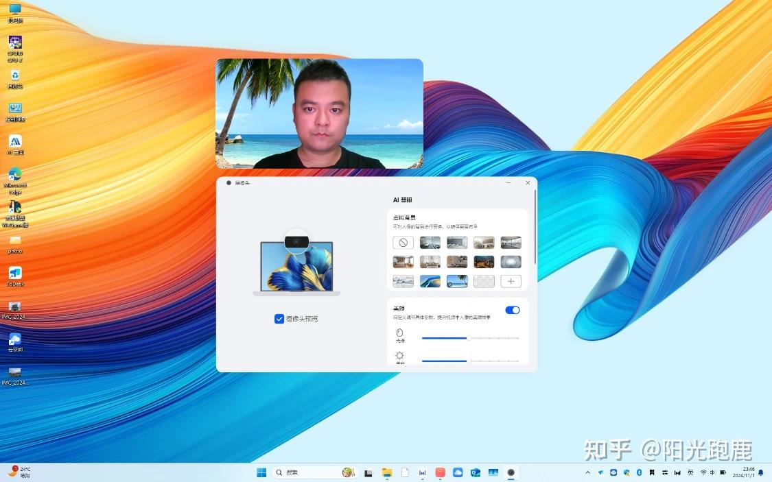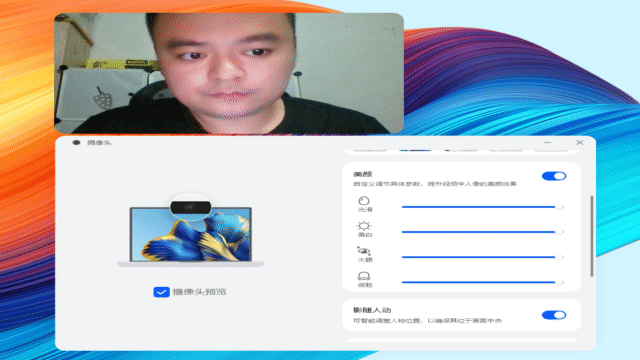 如果虚拟背景还不足以化解你素颜的尴尬,我们还能开启自定义美颜功能(美白、大眼、瘦脸)。不过更实用的功能还当属影随人动,当我们在移动身体的时候,摄像头会自动追踪移动中的人物,避免因移动出画或虚焦(与虚拟背景不能同时开启)。