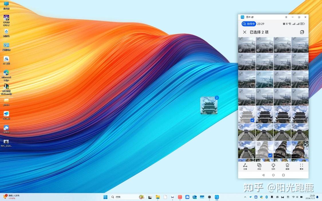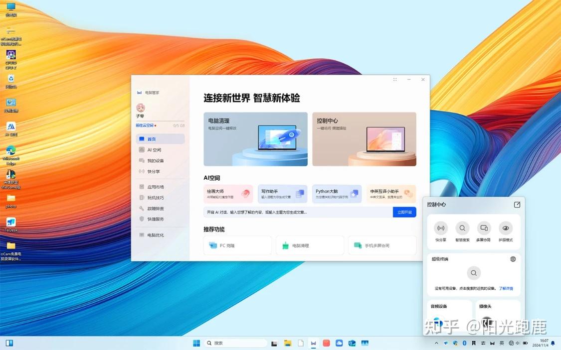 我们只需要打开电脑右下角控制中心,开启超级终端,就能在电脑屏幕上显示手机主界面,并进行多种协同操作,实测可以与华为Mate 60 Pro连接。另外,控制中心还集成了快分享、智慧搜索、多屏协同、护眼模式、以及AI摄像头等快捷功能。