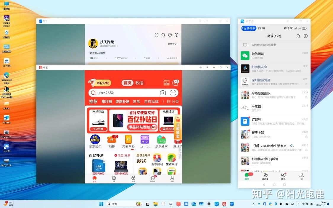 Hi MateBook系列支持在桌面上同时最多打开3 个手机窗口,比如开启微信APP、知乎APP、京东APP,一个屏幕实现聊天、阅读、购物三种职能,轻松Get一心三用的技能。