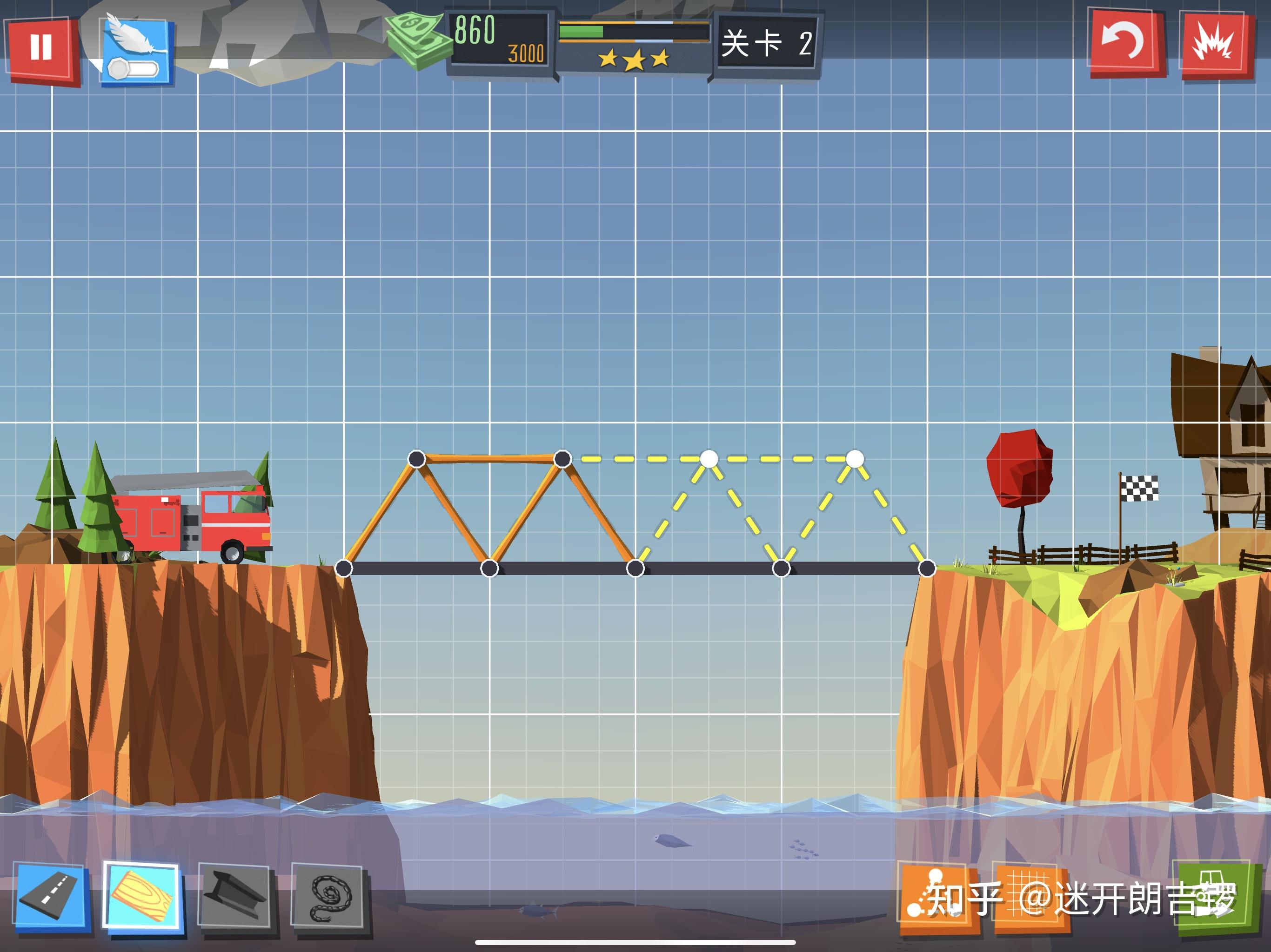 随着关卡难度的增加,通过的车辆会越来越重,你的材料也会越来越丰富,能造的桥的样式也越来越多——梁式桥、拱式桥、悬索桥、斜拉桥、刚构桥和组合体系桥……