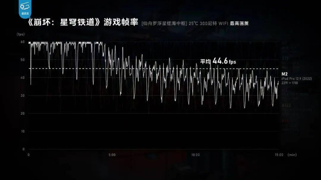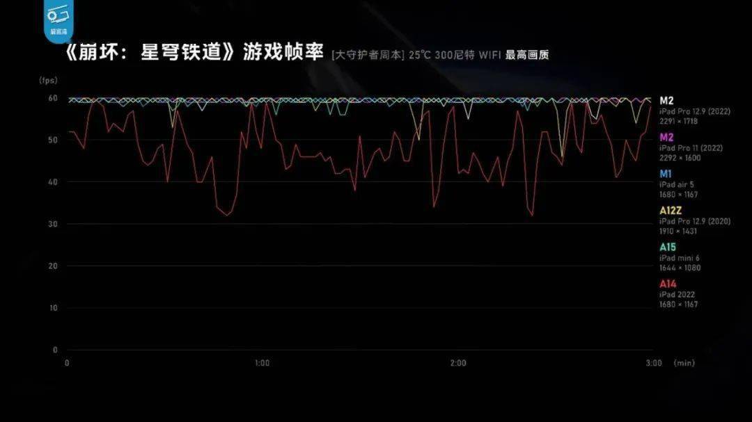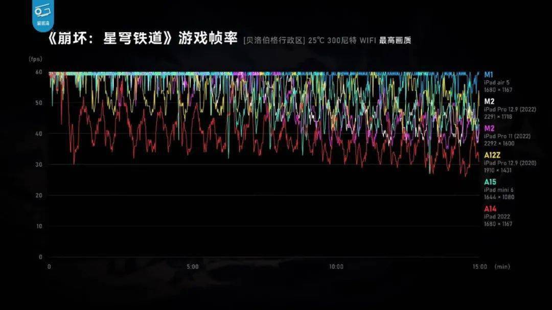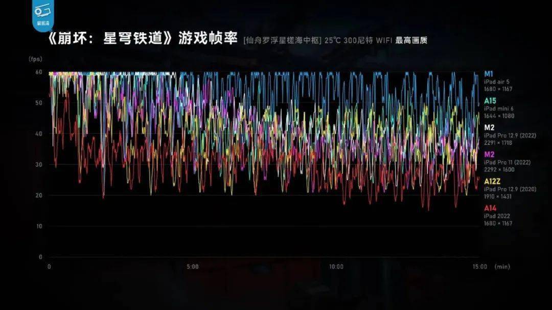 A12Z的分辨率比mini6更恐怖,即便A12Z的GPU性能比A15更强,即便12.9寸的散热比mini强得多,也依然没办法保持60fps。要知道降频前的平均功耗都要20w了,这个分辨率对老将A12Z来说还是有些吃力了。当然M1和M2的三台iPad没让人失望,哪怕顶着这么恐怖的分辨率,依然稳住了60fps的表现,M系列还是强而有力的。
