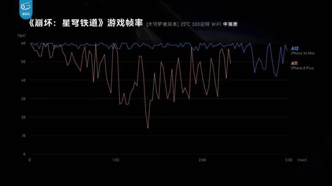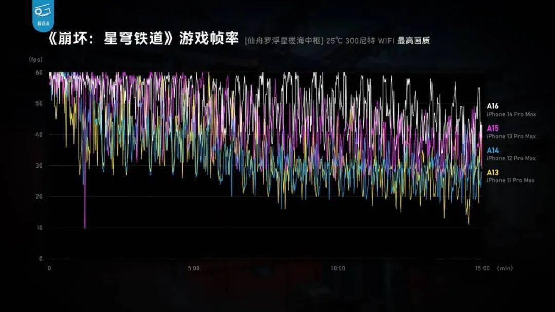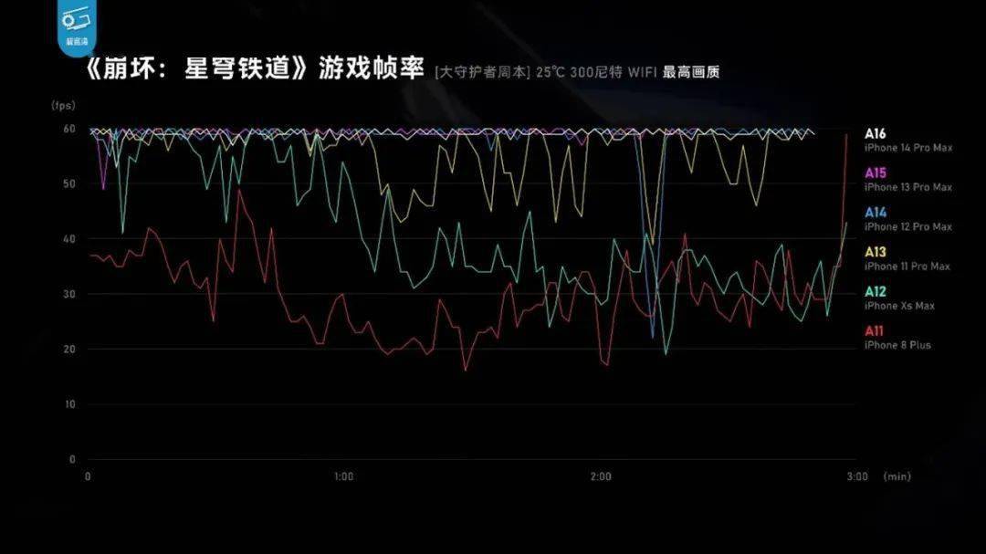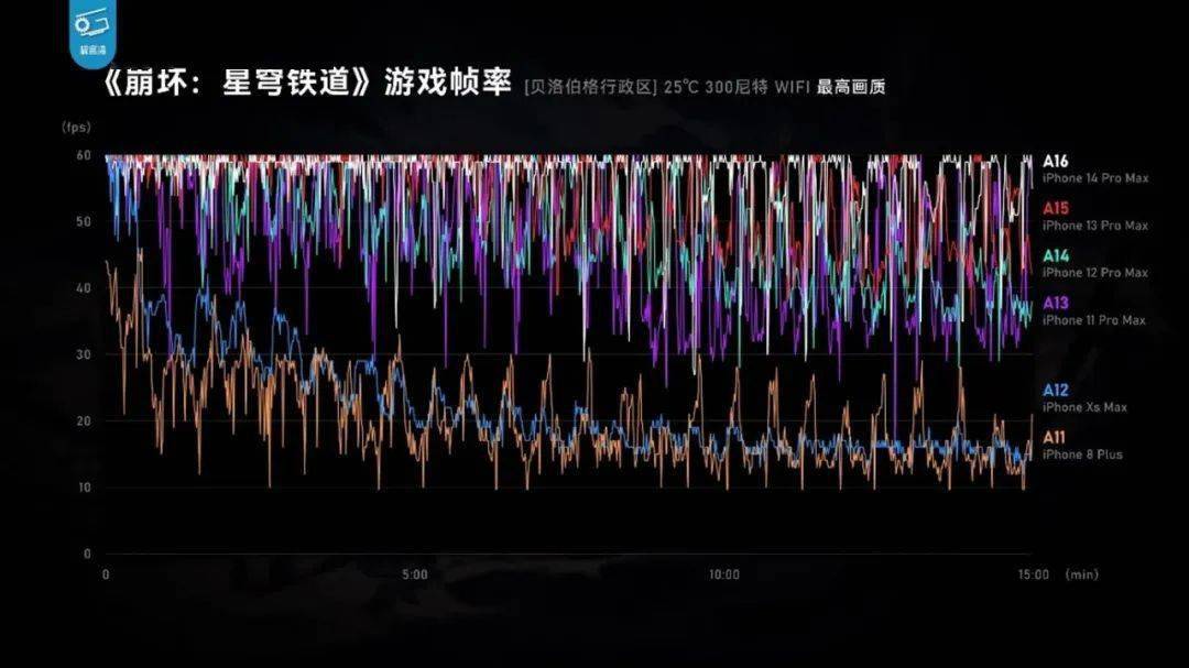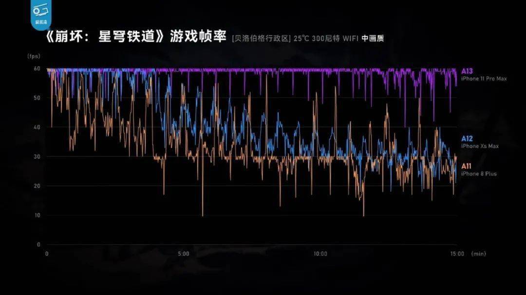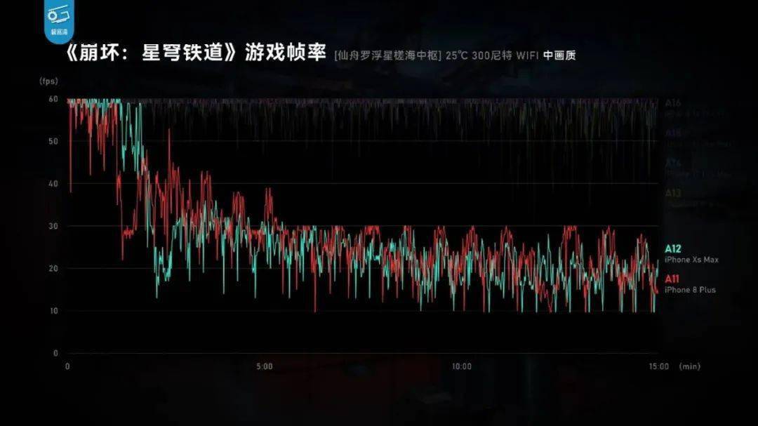 最高画质下,所有的手机都倒在了仙舟罗浮面前,看来要想流畅跑这个场景,得等A17了啊。所以我们降低到中画质,来看看这些手机们表现如何。中画质下,A13以上的机台机型基本上就可以跑到60fps了,但A12和A11的两台老iPhone依然扛不住这个压力。8P是因为A11的确太老了,Xs Max则是因为初代双层主板的散热能力是在捉急。