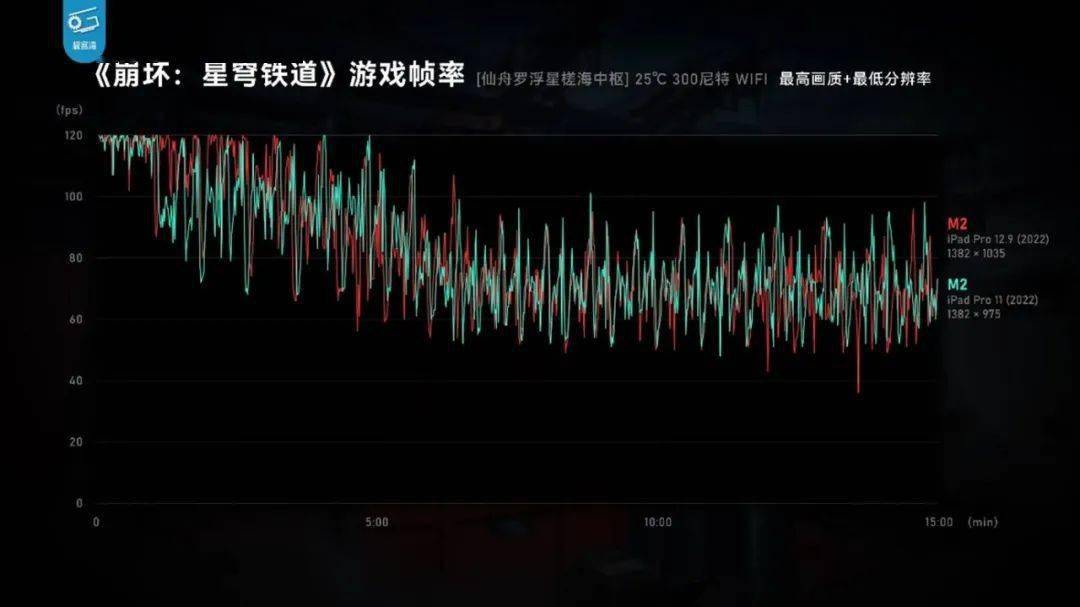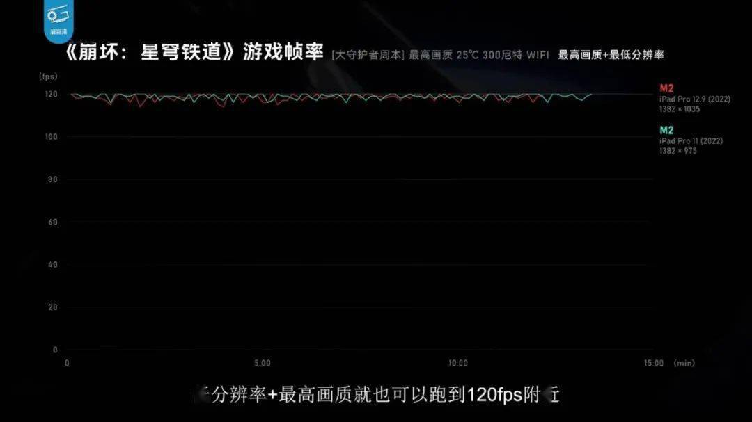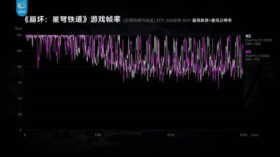 米哈游在M1和M2的iPad Pro上也开放了120fps的模式,我们也来试了一下当今最强的移动处理器M2到底能跑多少帧。在仙舟罗浮,最高画质不用想了,以那个分辨率,想跑120fps,估计3090都有压力。所以我们现实一点,把分辨率降到最低,其余设置保持最高,此时大小两款M2的iPad Pro都可以在前半程跑满120fps,但在后半部分因为散热压力实在太大,帧数还是会掉下去。而降低到中画质下,表现就要再好一些,但依然没法撑太久,散热压力还是太大了。