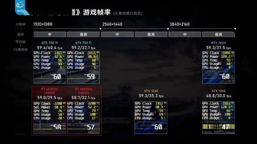 PC这边,1080P下,750Ti可以稳住60fps附近的平均帧,而1060在2K下也可以稳住60fps,但4K就吃不消了,4K下如果想稳定60fps,你还是需要3060这个级别的显卡才够用。6800HS的680M核显虽然在1080P分辨率最高画质下还是能接近60fps的,但CPU和GPU抢功耗和内存资源的现象比较明显,所以会有更多零星小卡顿。